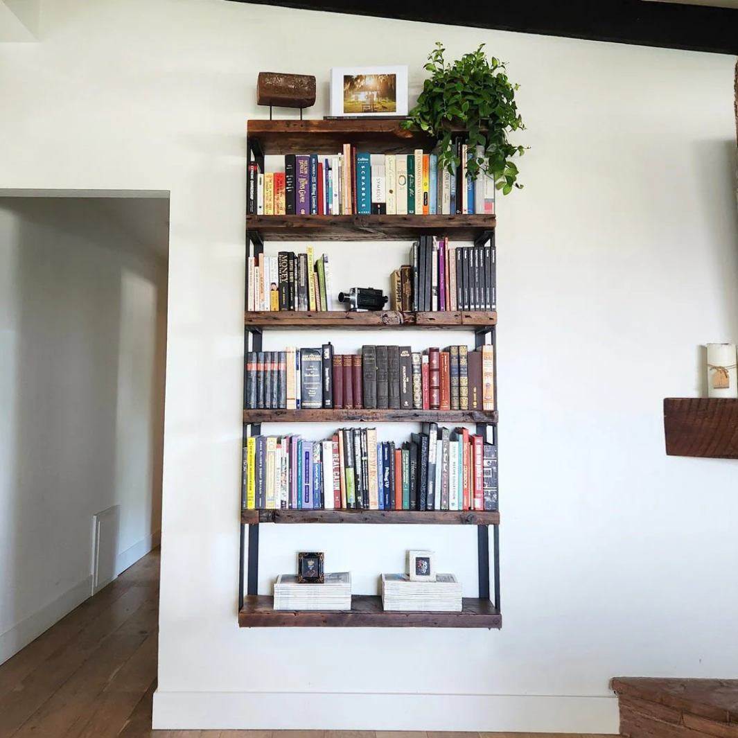 Modern industrial wall mounted bookcase in reclaimed wood and black steel, heavy duty